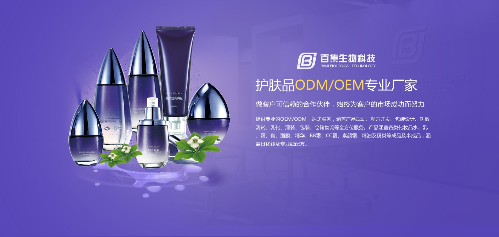 廣州市百集生物科技有限公司成立于2012年,坐落在亞洲化妝品硅谷的廣州市白云區,是一家具有現代化管理、專業化水準的化妝品研發及制造基地,為客戶提供專業的OEM/ODM一站式服務,涵蓋產品規劃、配方開發、包裝設計、功效測試、乳化、灌裝、包裝、倉儲物流等全方位服務。產品涵蓋各類化妝品水、乳、霜、膏、面膜、精華、BB霜、CC霜、素顏霜、精油及粉類等成品及半成品,涵蓋日化線及專業線配方。公司秉承“創新、共贏”的核心價值觀......